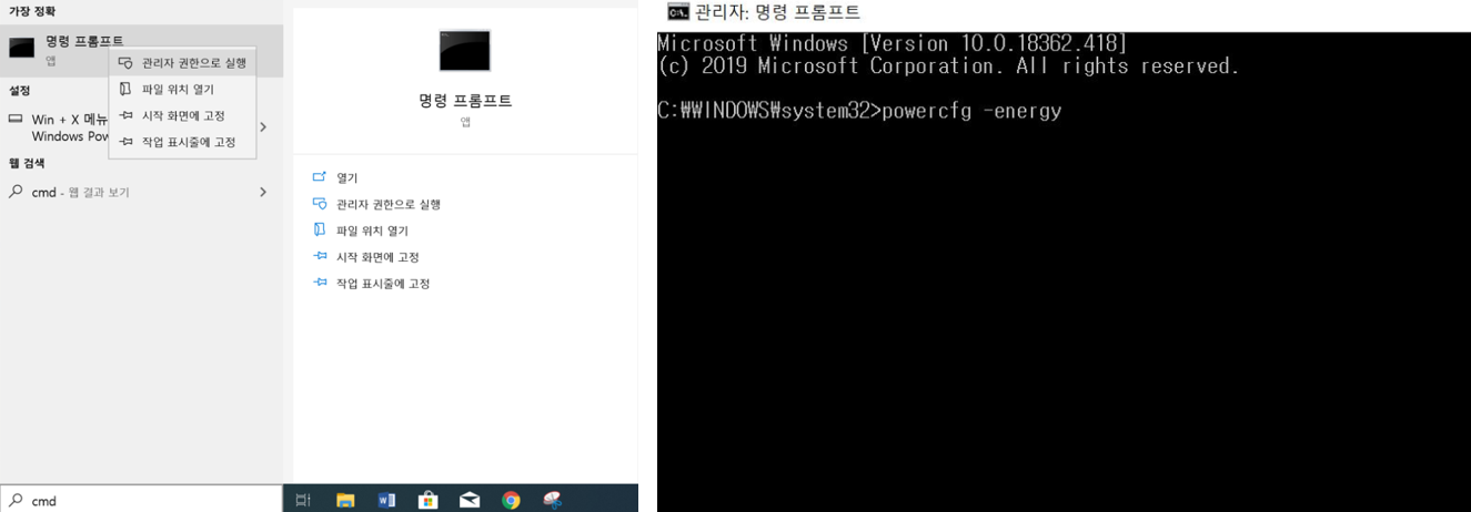 Step 2. 명령 프롬프트 창이 열리면 'powercfg -energy'를 친 후 엔터